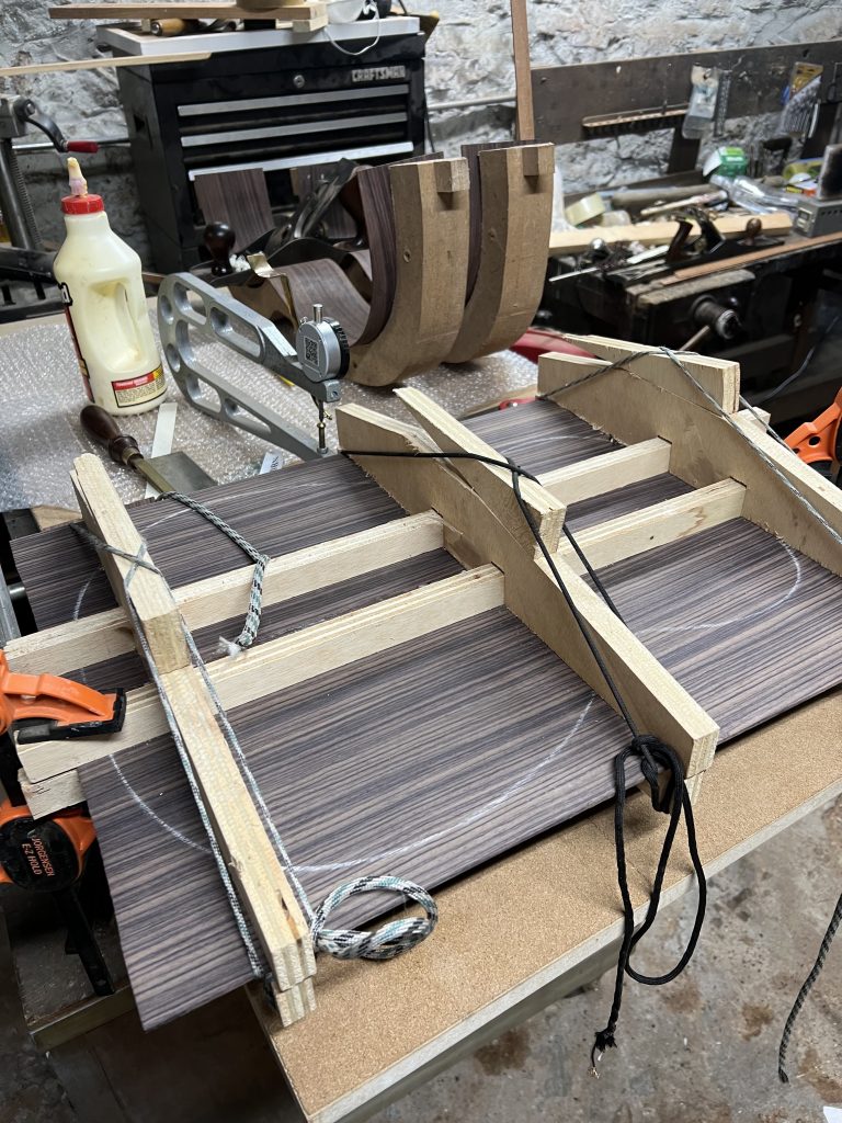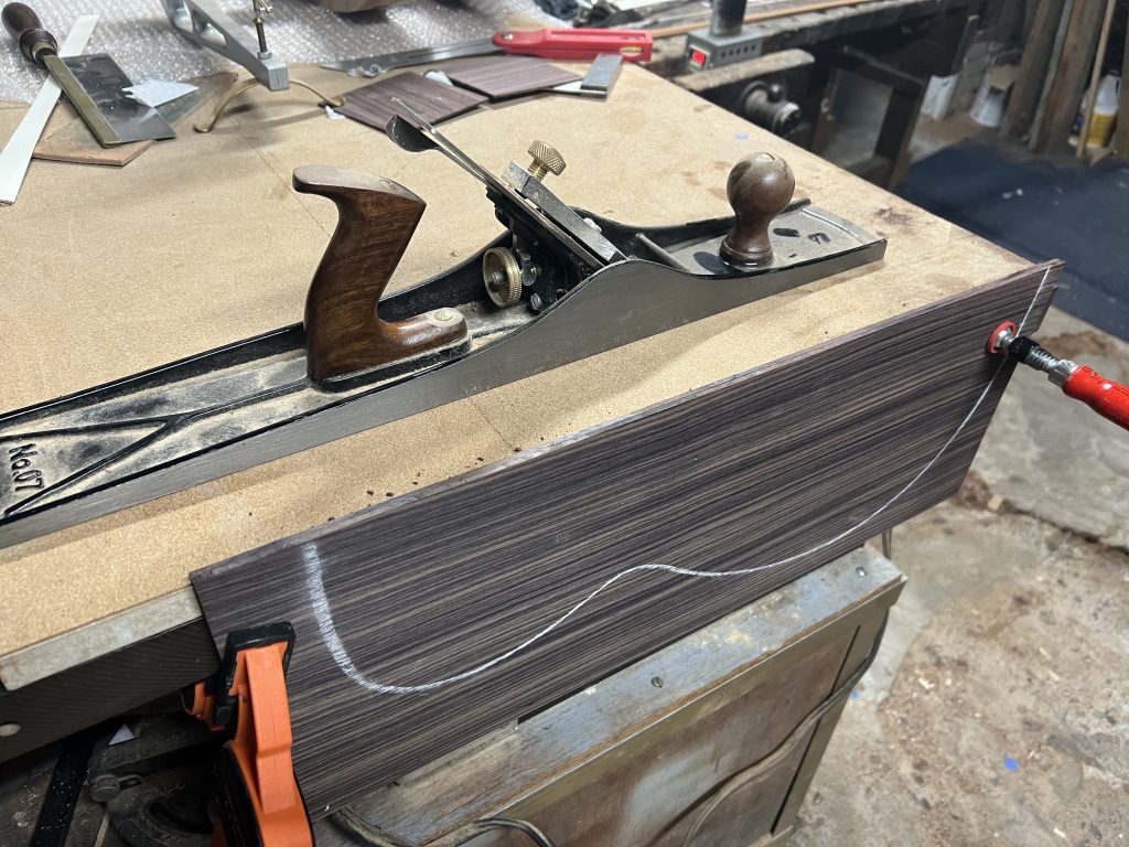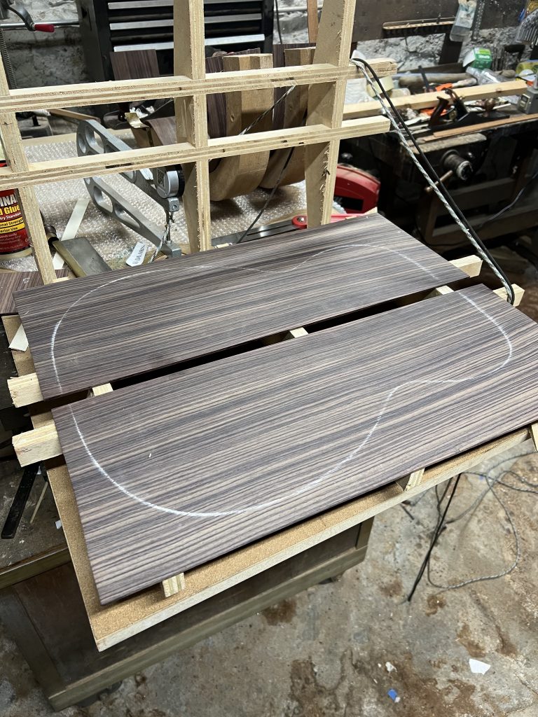 Both the top and back pieces of the guitar body consist of bookmatched pieces of stock which are intended to create a mirrored grain pattern in a single piece. When materials are acquired, they arrive as two separate pieces with need to be first edge planed, and then glued together to become a single sheet.